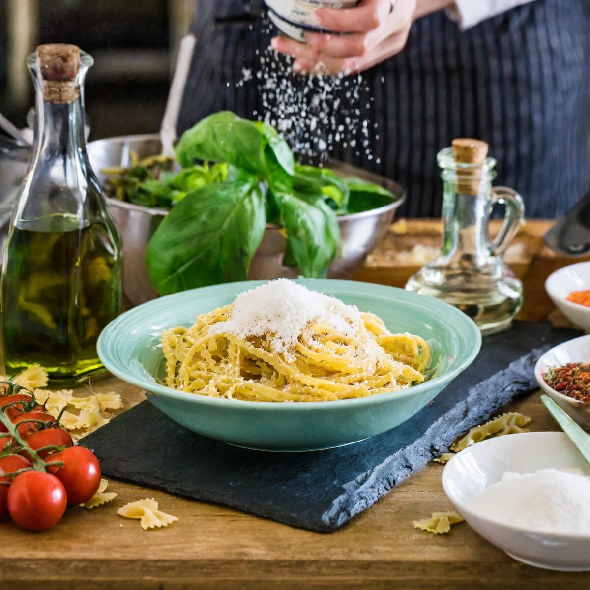 6) Mettere il formaggio grattugiato sugli spaghetti allo scoglio