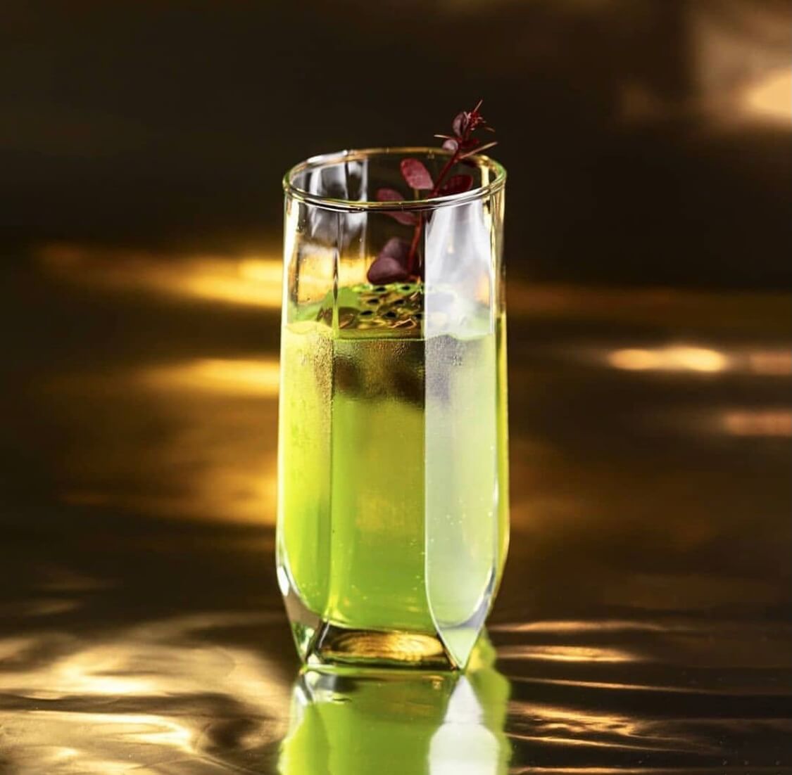 Versa tutti gli ingredienti in un bicchiere basso con ghiaccio. Infine guarnisci con cetriolo e menta.