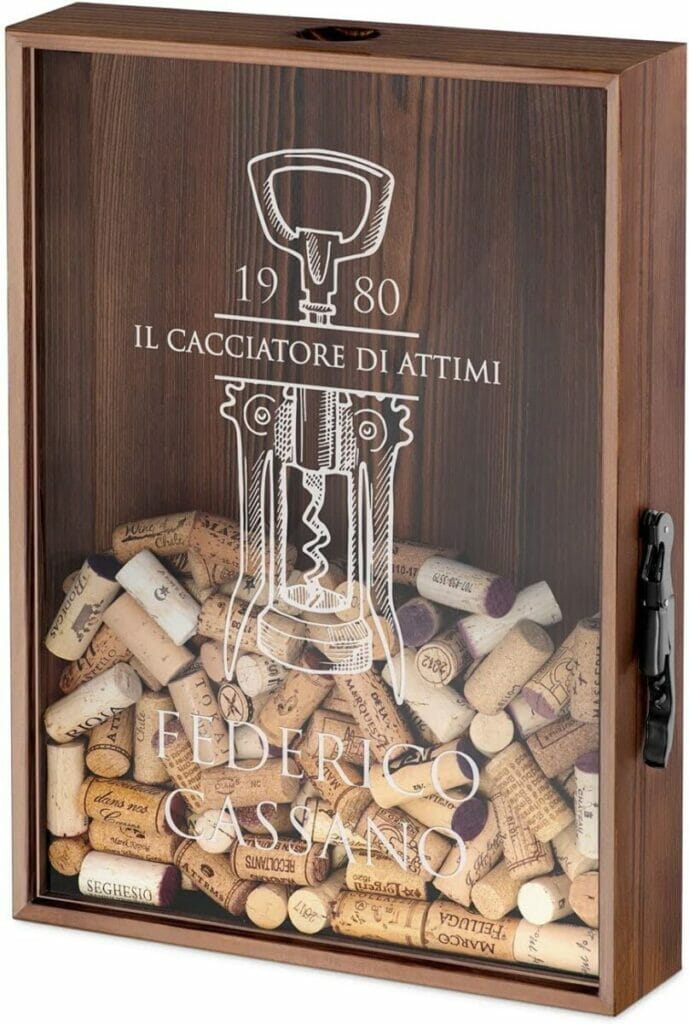 I tappi delle bottiglie stappate durante le serate speciali tutti conservati in un piccolo scrigno, da appoggiare su una mensola o da appendere al muro. Ecco un porta tappi di sughero, che si può personalizzare, con una stampa personalizzata di un testo a proprio scelta. Un bel regalo per ogni amante del vino, da esporre in cucina, in soggiorno o in sala da pranzo. Si chiama “Maverton” ed è in vendita su Amazon a 39,90 euro