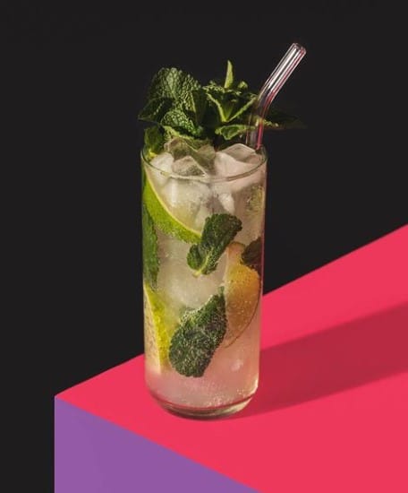 Pestare il lime nel bicchiere, aggiungere tutti gli altri ingredienti tranne lo champagne alla cannabis e mescolare, quindi riempire di ghiaccio pilè e completare con un top di Mac.