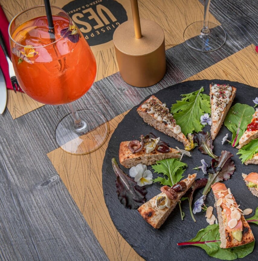 E non potevamo non terminare il nostro viaggio fra pizza e cocktail nella città della pizza per eccellenza. A Napoli, per l’aperitivo, il maestro pizzaiolo Giuseppe Vesi ha deciso di offrire nel suo locale al Vomero il connubio fra cocktail e “finger pizza”. Basate su impasti con farine pregiate e aromi particolari (curcuma, semi di papavero, tarallo e pepe), preparate con doppia cottura e farcite con ingredienti come stracciata pugliese e alici del cantabrico, crema di formaggio e tarallo napoletano, ricotta e pistacchio, mozzarella e pomodoro secco. Una proposta gourmet che da Vesi si gusta in pairing con un drink: la carta propone una variegata scelta fra cocktail e long drink accuratamente studiati per accompagnarsi alle pizze.