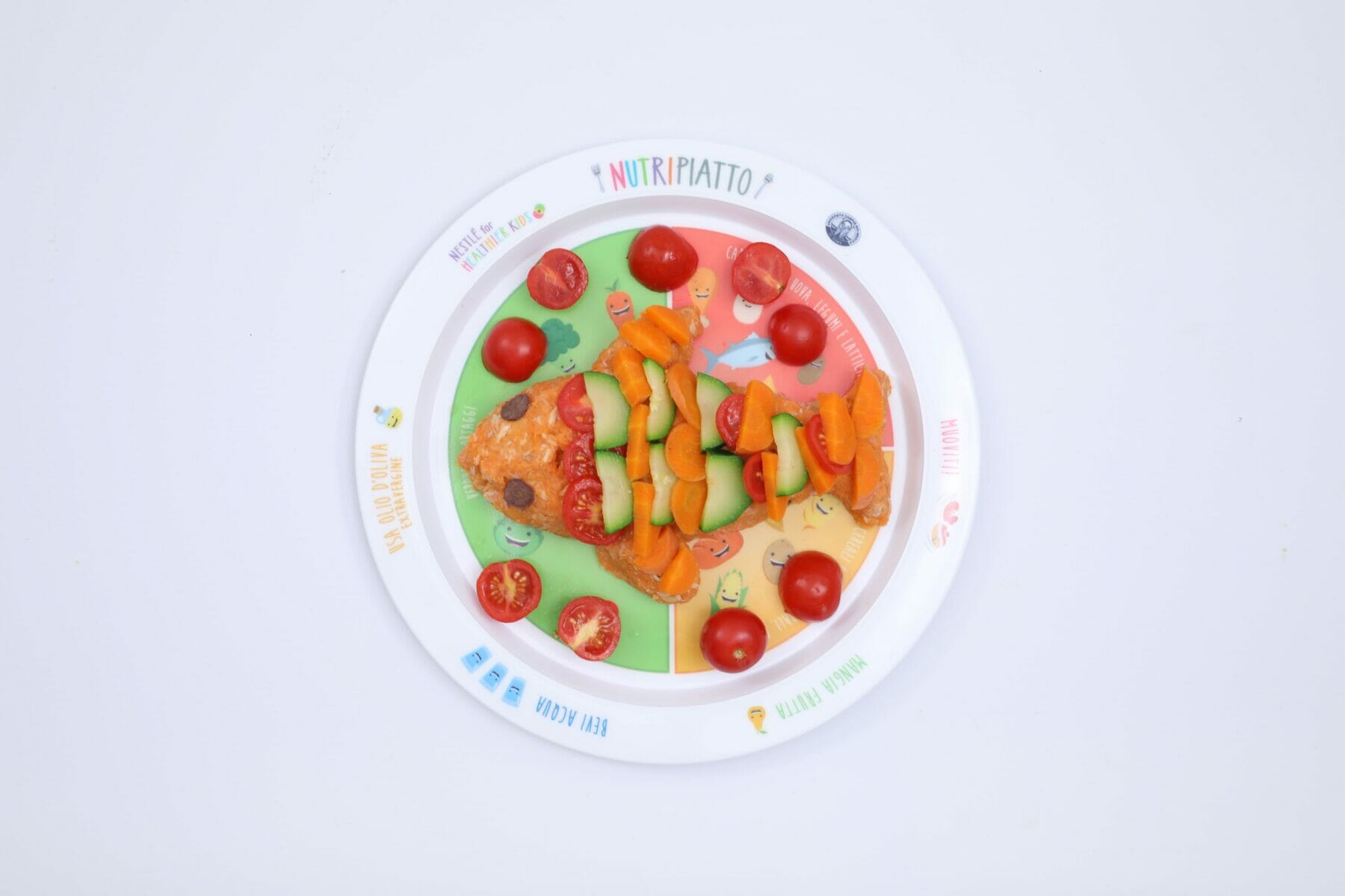 Prima tra le proposte pensate come piatto unico per il pranzo o la cena, è invece il Pesce Finto, dove l’impasto di sgombro e patate bollite viene utilizzato come base per ricreare la forma di un pesciolino e sopra, a decorare, vengono poste le carote e le zucchine bollite insieme ai pomodori.