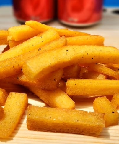 Dopodiché tagliate a fette regolari o a bastoncini la polenta, e friggetele per circa 8 minuti (attenti alla temperatura dell’olio che deve essere di 180° e a non immergere troppi pezzi alla volta per far scendere la temperatura).