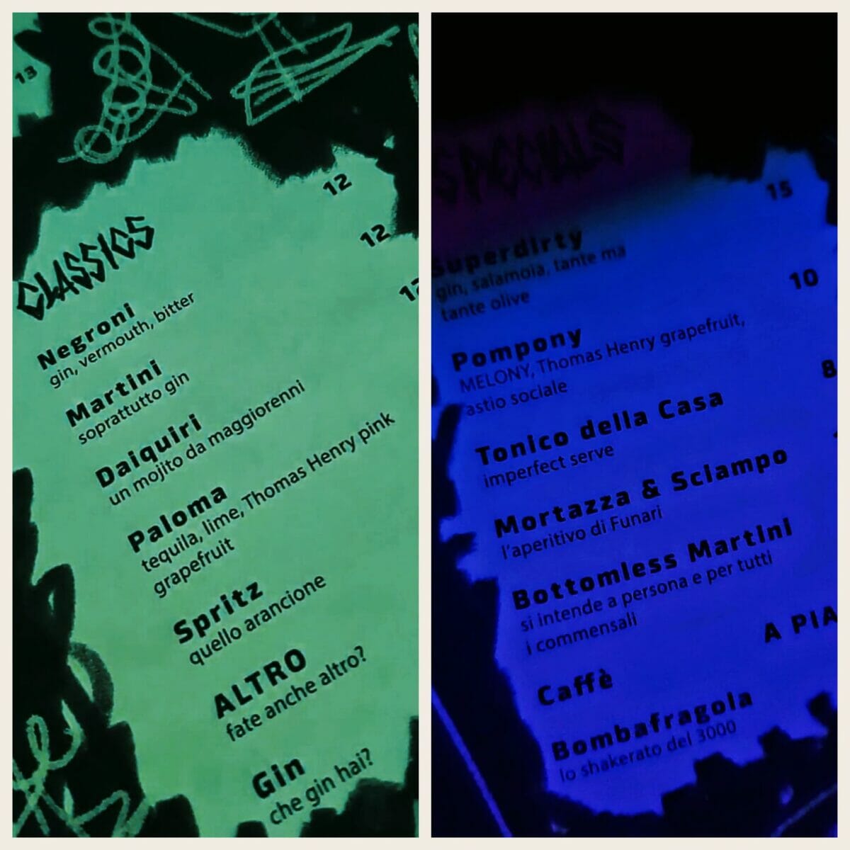 Intanto abbiamo potuto vedere la drink list, fra classici (generalmente fra i 10 e i 12 euro), qualche signature (dagli 8 ai 15 euro) e alcune proposte analcoliche. Divertente la formula (non inedita, ma poco diffusa) del Bottomless Martini: paghi 30 euro e bevi Martini finché vuoi (o puoi…). A proposito: non aspettarti di trovare la classica bottigliera multistrato dietro al bancone: la base di gran parte dei drink è costituita dalla linea di distillati Cringe dello stesso Farulla, confezionata in capienti taniche di plastica che fanno capolino da un apposito locale. Perfettamente integrate nell’ambiente “brutalista” del Dirty.