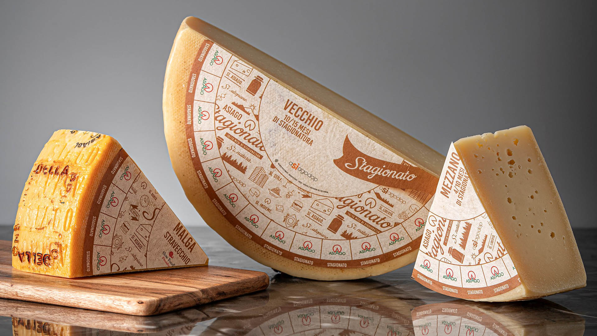 La crosta dell’Asiago Stagionato è liscia e regolare, con tonalità che variano dall’ambrato al bruno a seconda dell’invecchiamento.