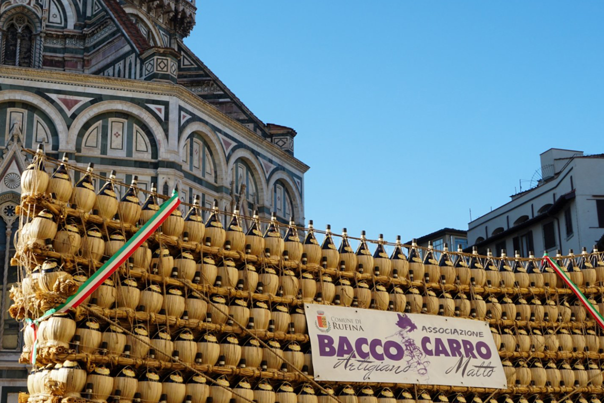 I “Fiaschi”, tipici contenitori in vetro di aspetto panciuto e rivestiti di paglia, vengono impilati, infatti, in una piramide ed intrecciati con paglia in modo da contenersi l’un l’altro: un sistema di trasporto eccezionale, ma anche un’opera di eccezionale maestria degli abili vignaioli della Val di Sieve, adesso riuniti nel Comitato per il Carro Matto di Rufina.
