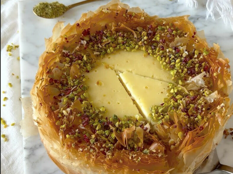Oggi la nostra amante di ricette vi propone la torta Baklava cheesecake con note di pistacchio e sciroppo agli agrumi. Qui di seguito la ricetta!