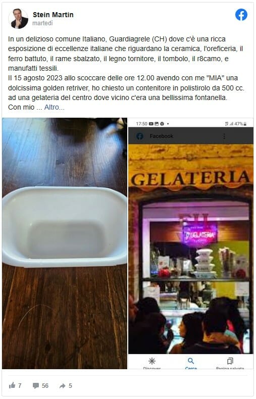E’ successo il giorno di Ferragosto a Guardiagrele, in Abruzzo. Racconta in un post su Facebook Stein Martin, tedesco e romano di adozione che si occupa di commercio all’ingrosso di prodotti alimentari: “Il 15 agosto 2023 allo scoccare delle ore 12.00 avendo con me ‘Mia’ una dolcissima golden retriver ho chiesto un contenitore in polistirolo da 500 cc. ad una gelateria del centro dove vicino c’era una bellissima fontanella. Con mio immenso stupore, alla mia richiesta hanno risposto che non potevano darmela, allora ho ribadito: guardi che è per far bere il cane, se vuole gliela pago. Mi hanno chiesto 1.50 euro senza scontrino, scocciati, e me l’hanno consegnata. Io sono rimasto basito e perplesso in questa estate dove tagliare a metà un tramezzino costa 2 euro succede anche questo”.