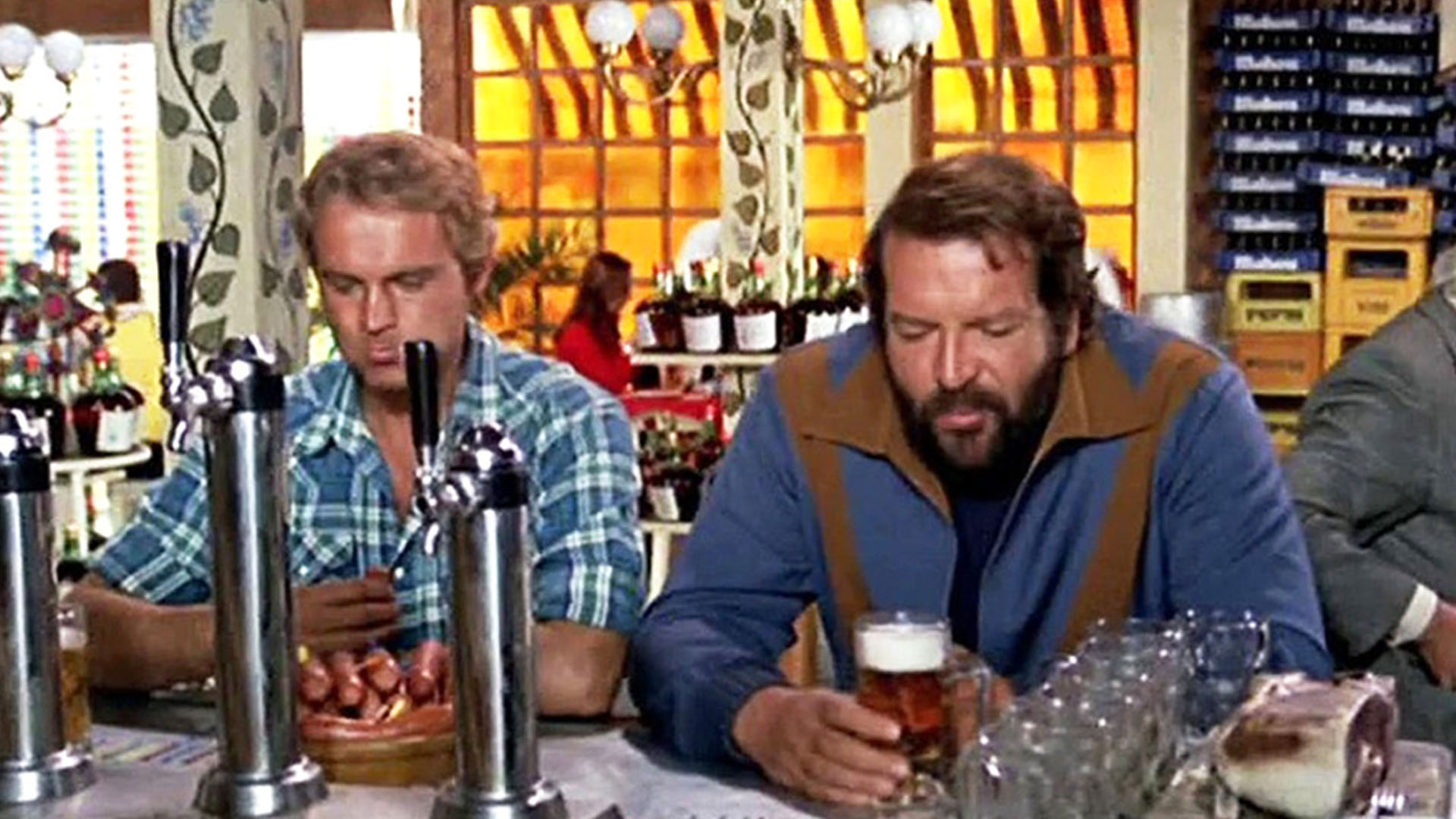 Altra commedia all’italiana e altra scena a base di birra e salsicce. I protagonisti questa volta sono Bud Spencer e Terence Hill, celebri e amati dal pubblico per le loro scazzottate, che dopo aver escluso il braccio di ferro e il gioco delle carte per dirimere la questione in ‘Altrimenti ci arrabbiamo’ (1974) si giocano la mitica macchina dune buggy a birra e salsicce.