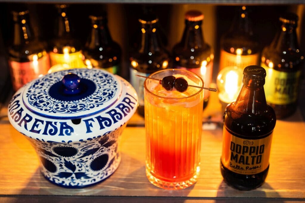 Il risultato è un drink che gioca sull’insolito contrasto tra i caratteri della birra (un’ambrata dal tono morbido e dal sapore deciso) e della fragola. Che, uniti alla soda, danno vita fin dal primo sorso a un bouquet di sapori e sfumature che vanno dal dolce all’amaro, dal luppolo alla frutta. A completare il cocktail, la garnish costituita da un’Amarena Fabbri 1905.