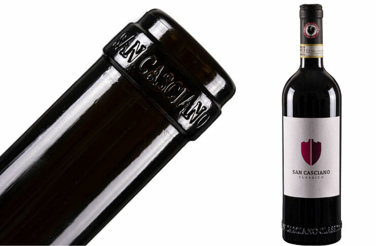 La bottiglia studiata è di vetro scuro, pesa 500 grammi e riporta il nome San Casciano classico in due posizioni, una sempre visibile in fondo alla bottiglia, l’altra inizialmente coperta dalla capsula.