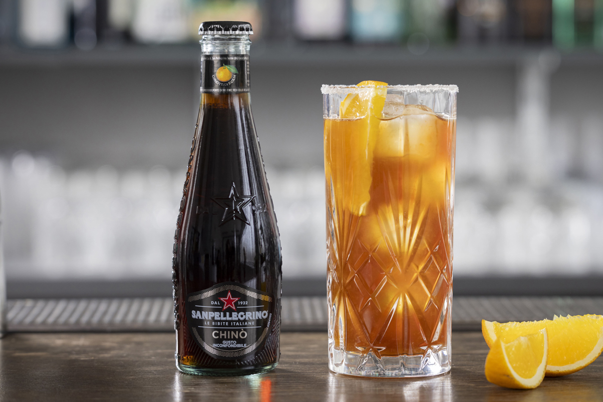 Per preparare Chinò Sling bisognerà creare un crust leggero di sale in un tumbler alto, aggiungere del ghiaccio e versare poi in sequenza lo sherbet all’arancia – realizzato con un’infusione di scorze di agrumi e zucchero – l’amaro e la soluzione acida, a base di acqua e acido citrico. Infine, aggiungere Chinò Sanpellegrino, mescolare delicatamente e completare il cocktail con una scorza o una fetta di arancia posta come decorazione.