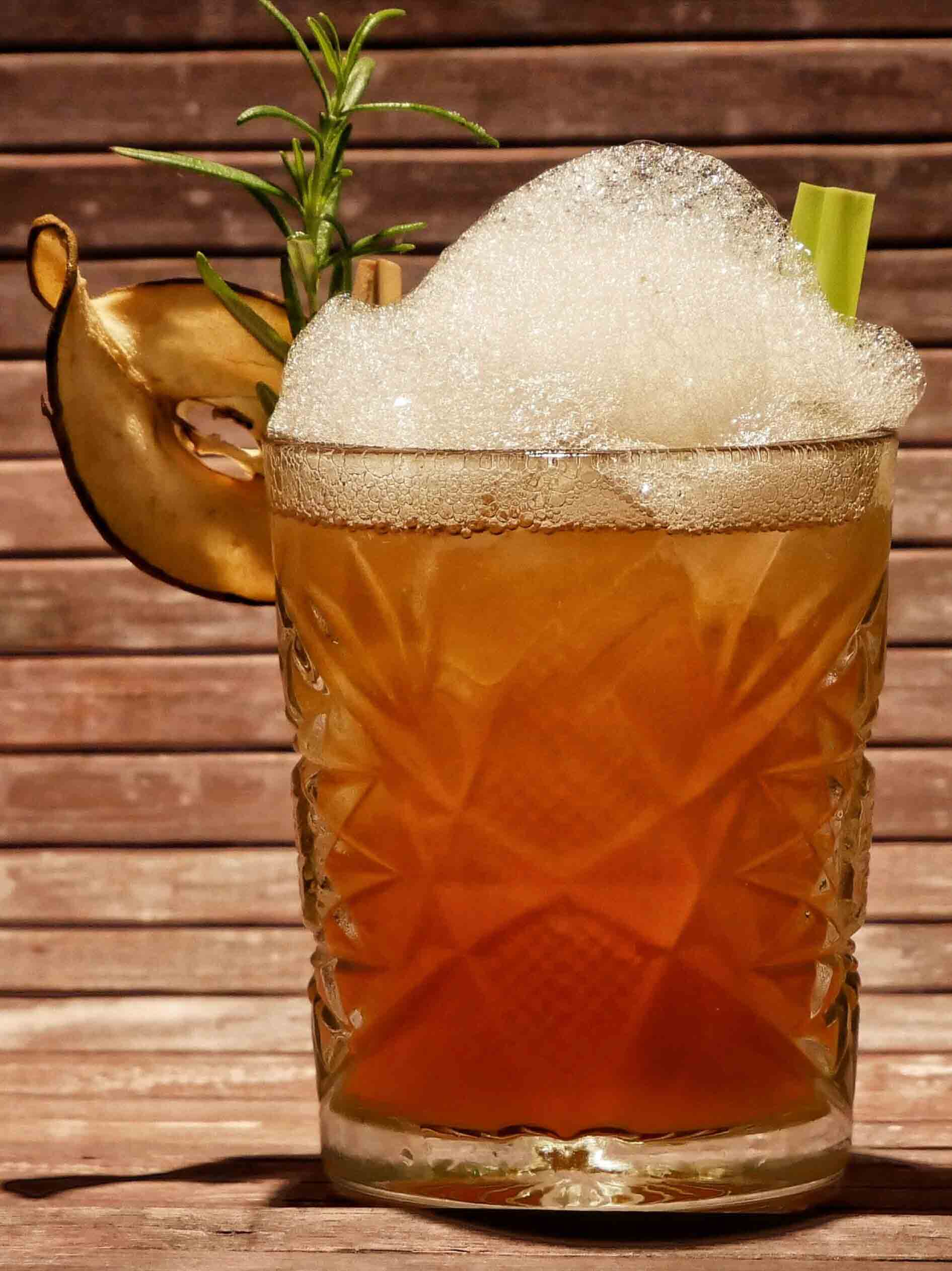 Spremere 1/4 di lime nel Boston, Versare LimeOlé e Pimm’s, dare una leggera Shakerata, filtrare e versare in un Tumbler Basso. Colmare con ghiaccio e completare con soda allo zenzero. Guarnire con aria di mela (montare la Lecitina di soia con estratto di mela e un po’ di acqua e zucchero) aggiungere il rametto di Rosmarino e la pera essiccata.