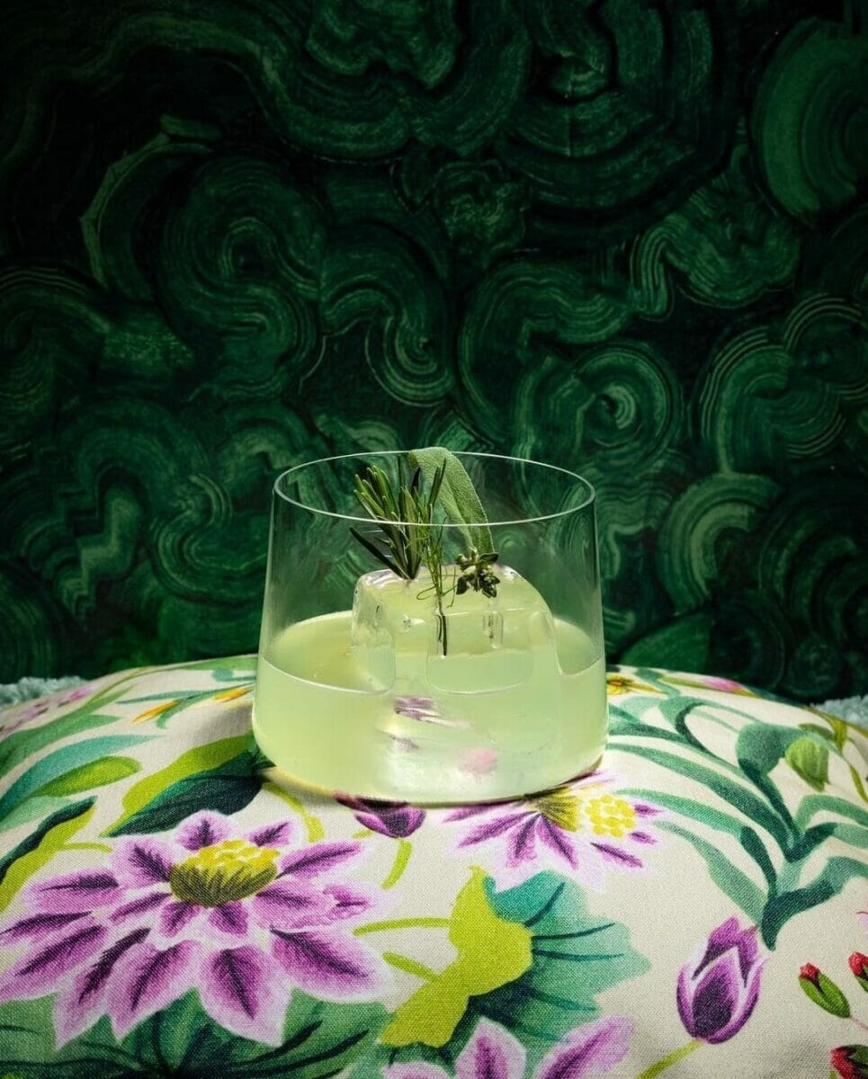 La garnish è funzionale ad attirare l’attenzione degli ospiti. Ecco quindi -per esempio- nel drink Verde un cubo di ghiaccio forato in cui vengono inserite delle erbe e nell’Iride delle palline colorate.