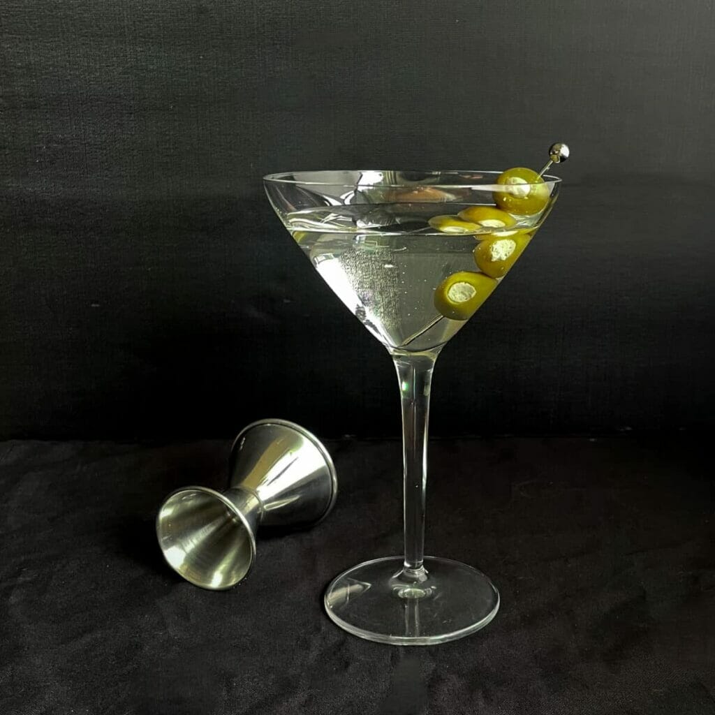 Scorza di limone (dopo averne spremuto l’essenza sul bordo del bicchiere) oppure olive verdi