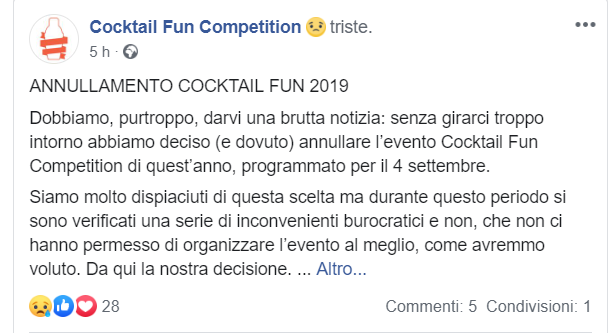“Dobbiamo, purtroppo, darvi una brutta notizia: senza girarci troppo intorno abbiamo deciso (e dovuto) annullare l’evento Cocktail Fun Competition di quest’anno, programmato per il 4 settembre”.