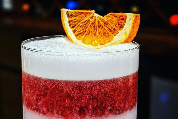 Inserire tutti gli ingredienti (tranne il vino rosso) in uno shaker senza ghiaccio e agitare bene. Aggiungere un cubetto di ghiaccio grande e shakerare di nuovo. Filtrare due volte in un tumbler bicchiere sottile (@amehla_co). Lasciare depositare la schiuma. Concludere con un floap di vino rosso. Per ottenere l’effetto bicolore, versate il vino rosso sul dorso del barspoon, lentamente. Guarnire con una fetta di arancia fresca o disidratata (@thecocktailguarnish).