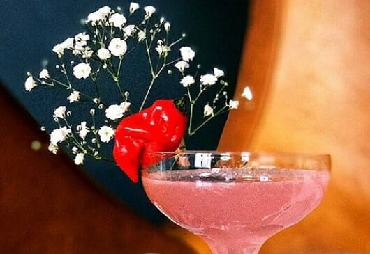 Tecnica: Shake and Strain Ingredienti: 45 ml Tequila 15 ml oz Cointreau 20 ml Succo di lime 10 ml Scotch Bonnet Syrup Top di Guava Soda Garnish: Peperoncino -Scotch Bonnet Pepper e fiori