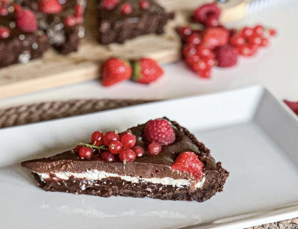 Versare la ganache sopra lo strato di panna e unire i frutti di bosco e le fragole. Pronta! Conservare in frigo