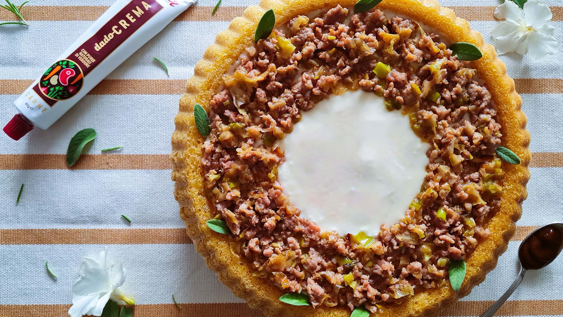 Un profumo che avvolge, una consistenza che coccola il palato e un sapore ricco di contrasti armoniosi: la crostata salata con porri e salsiccia è il piatto che unisce tradizione e creatività. È perfetta per un pranzo in famiglia, una cena tra amici o per un aperitivo sfizioso. Il cuore cremoso con stracchino, porri stufati e salsiccia si fonde alla perfezione con la base soffice e saporita, mentre l’aggiunta di DADOCREMA Bauer gusto Carne, in pratico tubetto, esalta ogni morso con un tocco deciso e avvolgente.