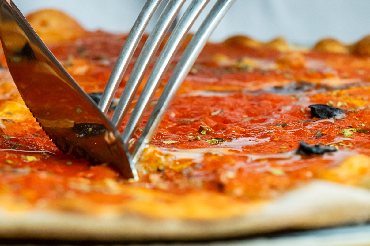 Le due cucine, totalmente indipendenti, vedono da un lato la presenza in bella vista al pubblico di un Neapolis (Moretti forni), forno a legna adattato all’elettrico, che accoglie fino a 9 pizze convenzionali, il cui impasto viene realizzato in separata sede (in panificio e trasportato opportunamente imbustato, per impedire contaminazioni); lievitazione di minimo 48 ore, farine 0 e 00, un panetto da 180 gr. steso rigorosamente al mattarello.