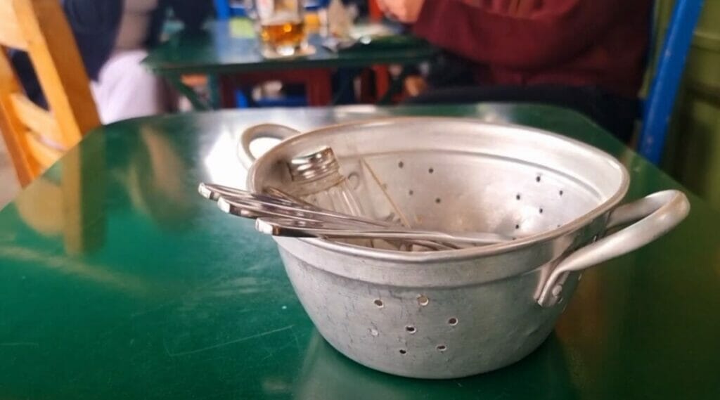 Lo abbiamo visto al Gazohori, ristorante di cucina tipica greca nella zona di Gazi, ad Atene. Alcuni vecchi scolapasta in metallo, di quelli piccoli, la cui forma richiama immediatamente l’atmosfera delle trattorie di una volta o della cucina della nonna, sono stati “riciclati” come contenitori per portare in tavola il coperto: forchette, coltelli e tovaglioli. Pratici e originali.