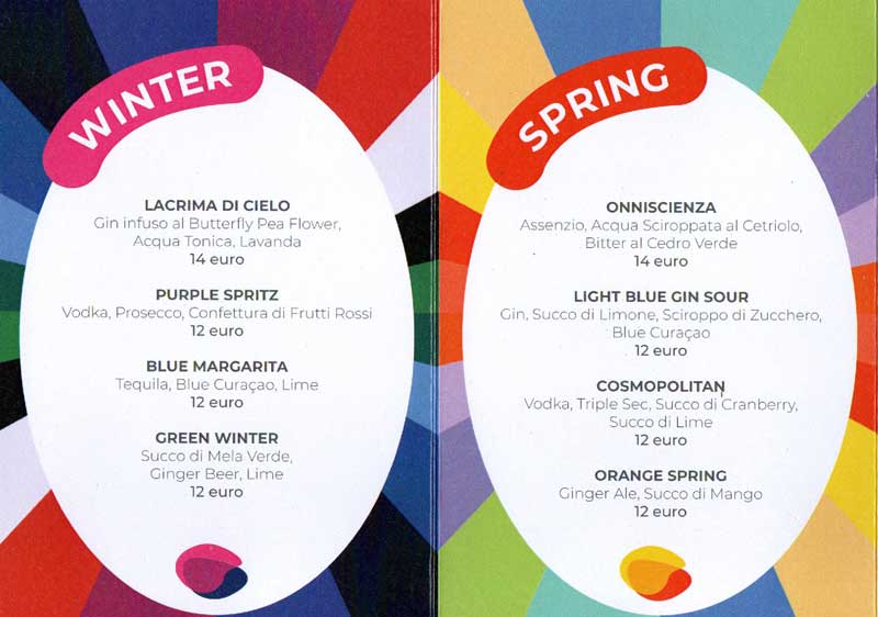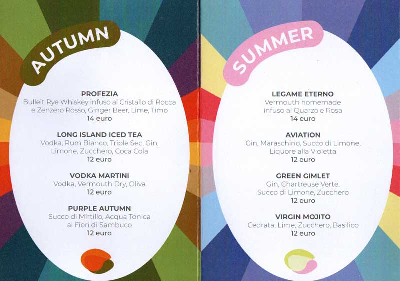 Infine, arriva il gioco. A ogni profilo armocromatico (e, di conseguenza, a ogni stagione) sono associati quattro drink, presentati in una special cocktail list creata per l’occasione (vedi foto): 16 cocktail, dai 12 ai 14 euro.