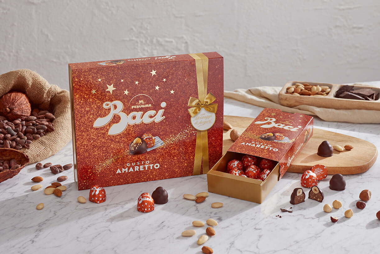 È l’amaretto il nuovo gusto scelto da Baci che si ispira alla tradizione italiana delle feste ed è racchiuso in una veste brillante con all’interno, per la prima volta, i cartigli con messaggi di auguri