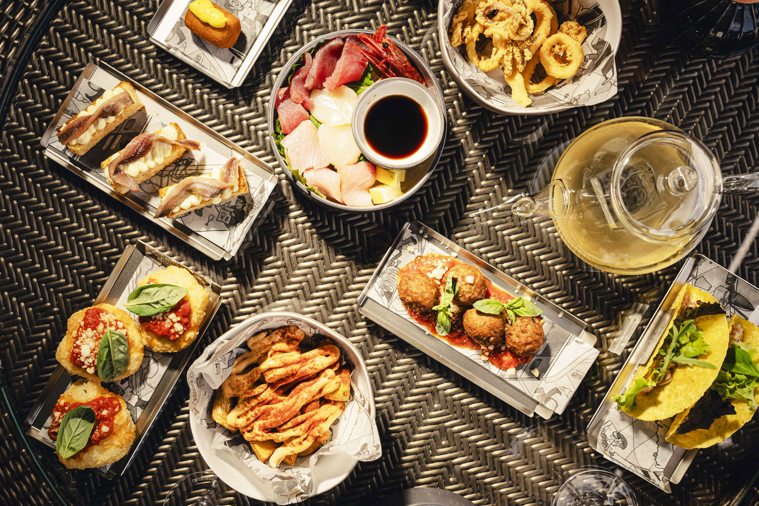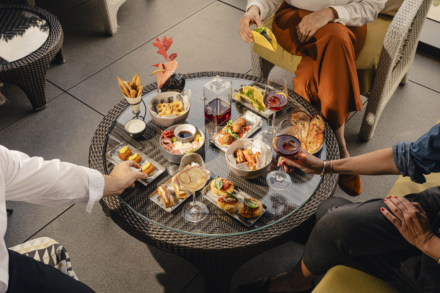 L’offerta gastronomica porta la firma dello chef Vincenzo Lebano, Executive Chef dell’hotel. Il menu propone tapas raffinate come il “Crudo di mare” con capasanta, tonno, ricciola e gambero, i “Tacos con tartare di ricciola”, le “Crocchette d’astice con maionese allo zafferano”, i “Pimientos del padron con bottarga e scaglie di bonito” e le classiche “Patate bravas mediterranee”.