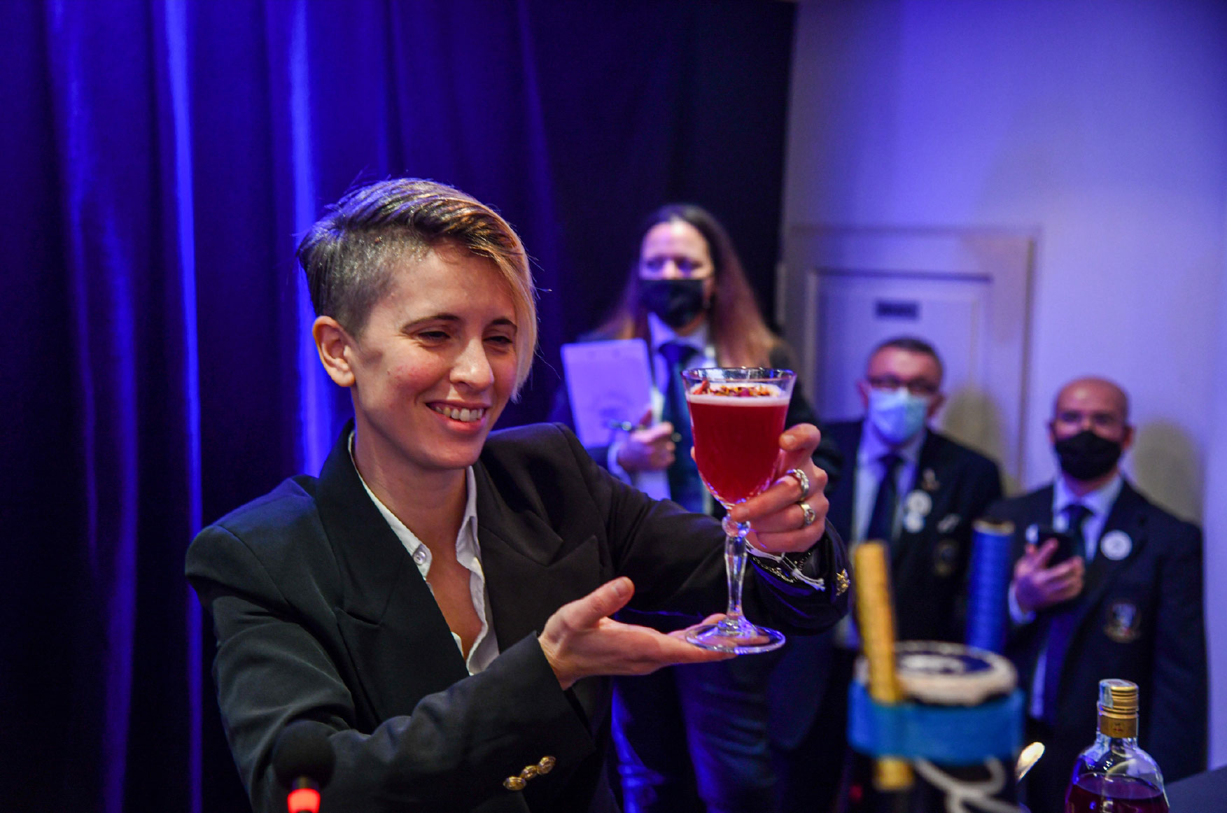 Gestualità da performer del bancone, accompagnata da un ottimo speech in inglese, ha coinvolto la giuria raccontando le tappe che l’anno portata fino a diventare una protagonista della mixology in rosa e la prima Lady di origini felsinee del concorso.