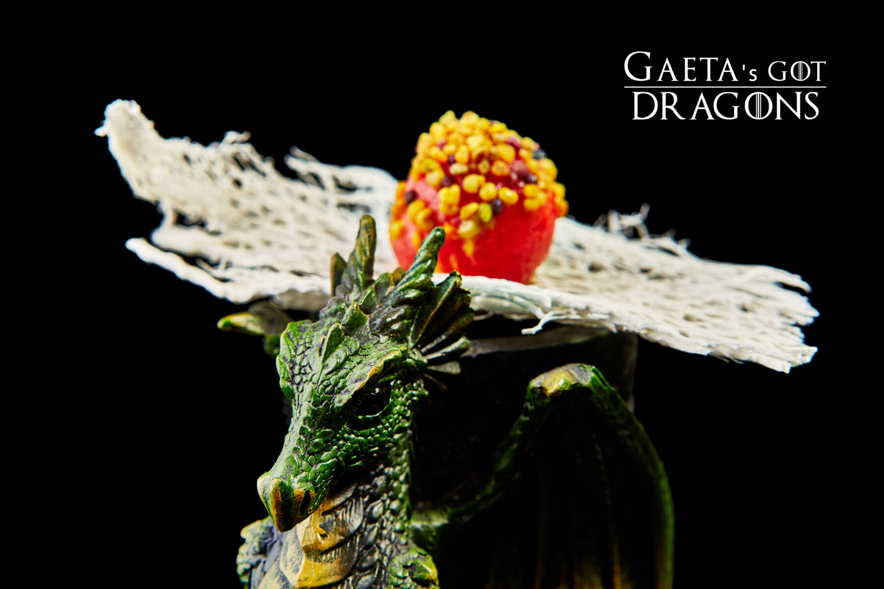 “Gaeta’s Got Dragons è un fantasy cocktail, un omaggio ad una delle serie televisive più seguite degli ultimi anni. – spiega Fabio – Un fuori menù unico e suggestivo creato in occasione delle riprese, che interesseranno la città di Gaeta, di Bloodmoon il prequel de il Trono di Spade. In uno degli scenari più suggestivi, la Grotta del Turco, fervono i preparativi che hanno come colonna sonora le onde del mare. Io nel mio piccolo non potevo non sentirmi coinvolto, anche perché, lo ammetto, il Trono di Spade è stata la mia droga degli ultimi tempi…Come non omaggiare la regina Daenerys e i suoi tre figli dal respiro di fuoco Drogon, Viserion e Rhaegal, simbolo del potere e della conquista.