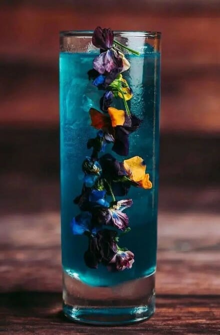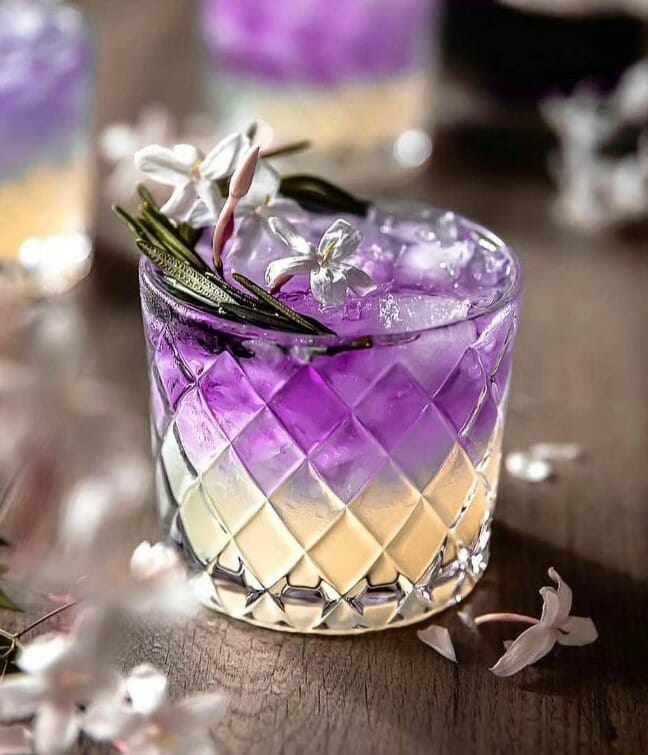un cocktail preparato con gin, sciroppo alla lavanda, sciroppo di fiori blu (butterfly Pea Flowers) e decorato con fiori edibili. La ricetta è di Christos Economis, bartender ateniese.