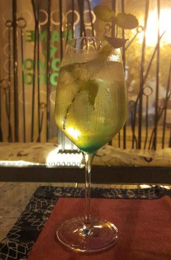 Vodka, acqua tonica, estratto di menta e olio evo con aggiunta di menta decorativa e