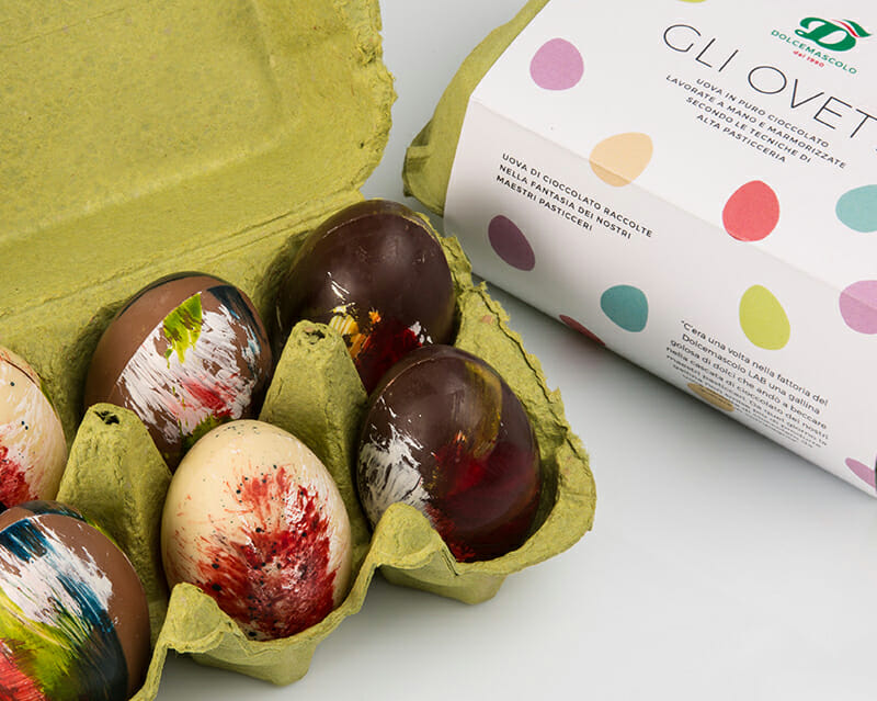 Ad accompagnare la pluripremiata colomba artigianale di Matteo Dolcemascolo quest’anno arrivano gli ovetti in puro cioccolato, lavorati a mano e marmorizzati secondo le tecniche di alta pasticceria, che aprono la nuova categoria dei cofanetti sull’e-commerce Dolcemascolo.