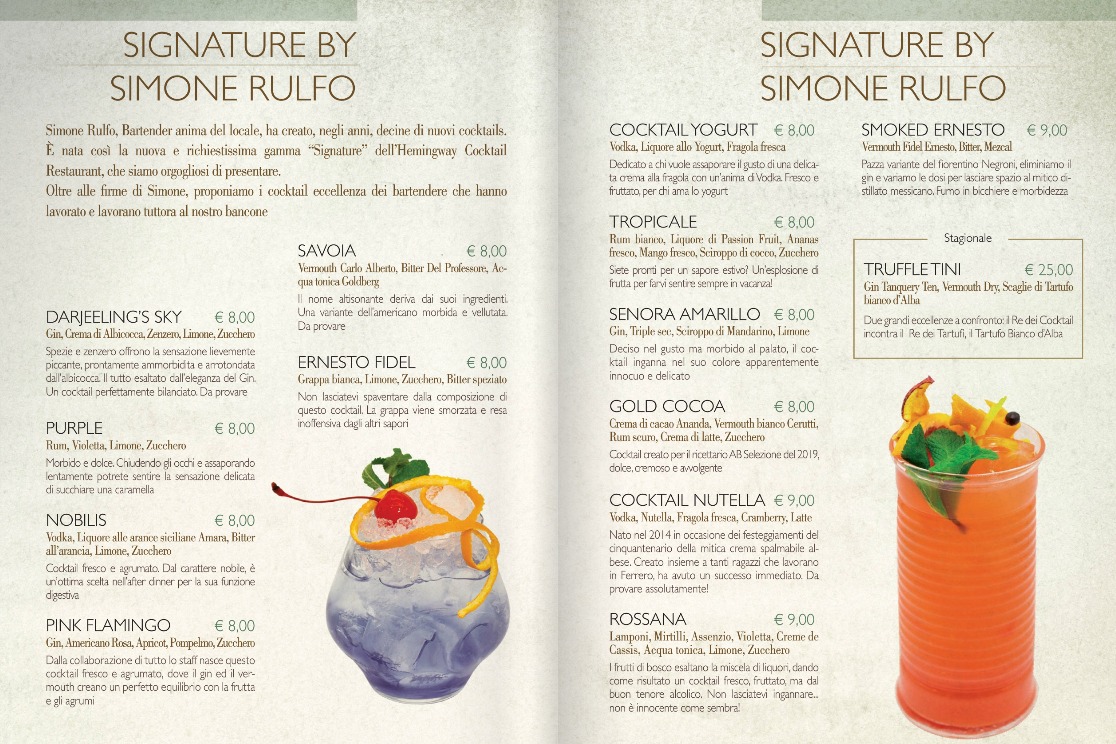 Una splendida selezione di classici, con un’attenzione particolare ai drink amati da Hemingway e alle tante varianti del Martini Cocktail, e una proposta di signature a cura di Simone Rulfo tra cui il scenico Purple, che vi racconteremo prossimamente.