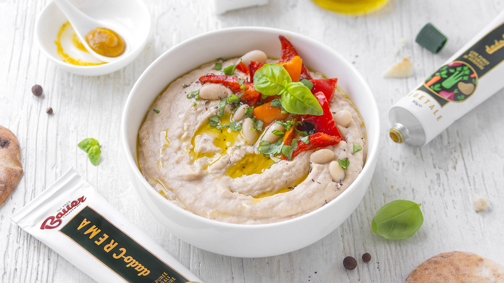 Il procedimento è semplice e alla portata di tutti: basterà frullare in un mixer i fagioli cannellini ben scolati (conservando una piccola quantità del liquido di cottura) insieme alla DADOCREMA Bauer, alla tahina, al succo di limone, all’aglio privato dell’anima, alle spezie e all’olio. Il segreto per una crema davvero vellutata? Aggiungere un goccio del liquido tenuto da parte per regolare la consistenza.