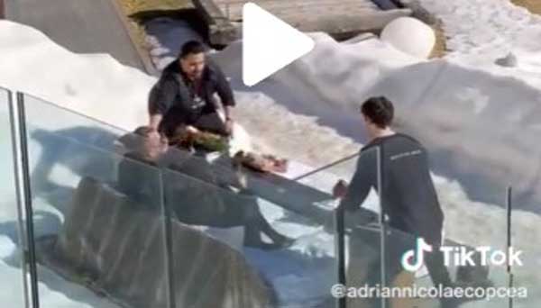 Il video mostra una coppia seduta su un divanetto all’aperto, sulla neve, nel momento in cui i due camerieri cercano di servire l’aperitivo su un lungo vassoio che deve essere appoggiato su due ceppi. Evidentemente, la scarsa competenza degli addetti al servizio causa il “disastro”: subito dopo essere stato poggiato sui ceppi, il vassoio si rovescia, fortunatamente sul lato opposto rispetto ai clienti.