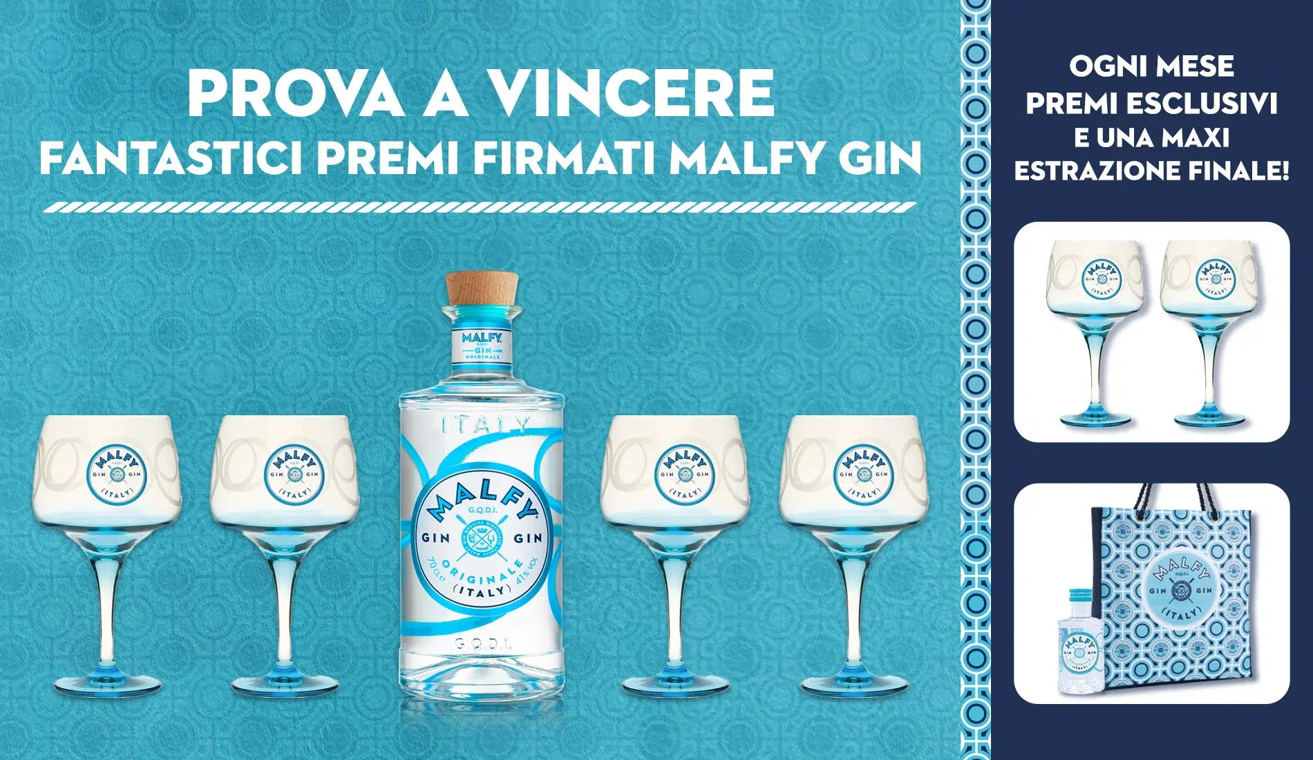 Fino al 31 maggio, invece, tutti coloro che si iscrivono sul sito di Malfy Gin (del gruppo Pernod Ricard) partecipano al Mafy Contest, con cui possono vincere ogni mese diversi premi brandizzati Malfy (bicchieri, bag, mini bottiglie). Non solo: avranno anche la possibilità di partecipare alla maxi estrazione finale che assegnerà al vincitore un kit composto da una bottiglia di Malfy Gin Original e quattro bicchieri.