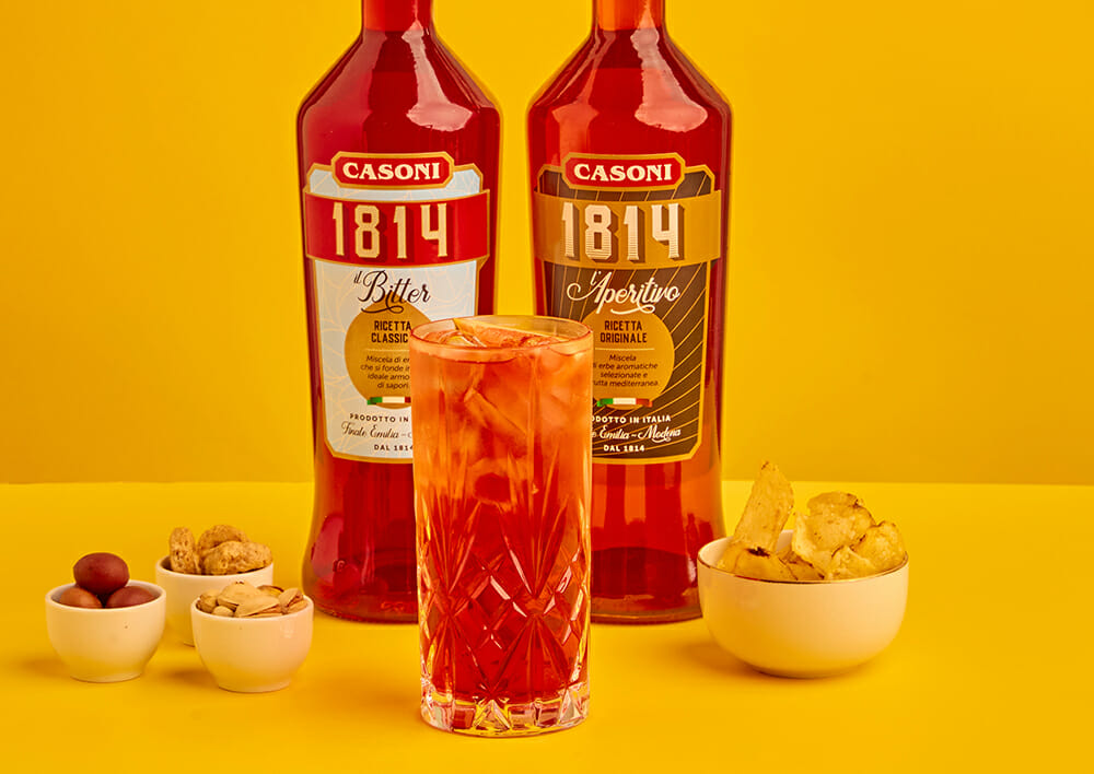 Per preparare CASONI, mettete il ghiaccio nel bicchiere. Quindi versate 1814 – l’Aperitivo, seguito da Bitter 1814 Casoni.
