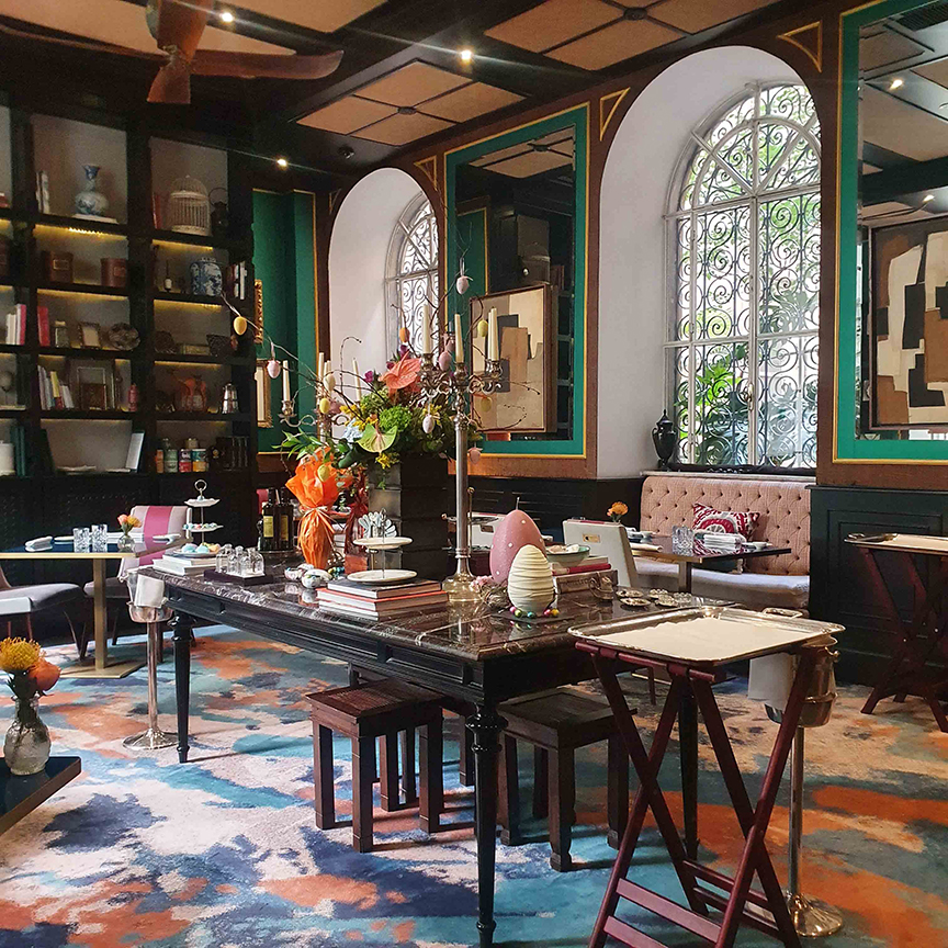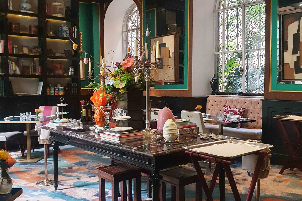 In giro, tante uova di cioccolata fatte a mano dal pastry chef Andrea De Benedetto. Colorate, decorate ad arte e tutte edibili. Sono ovunque: sui tavoli in salotto, sul bancone del cocktail bar, sul grande tavolo al centro della sala ristorante tra i bouquet di fiori. Viene voglia di fare Egg Hunting per ammirarle tutte.