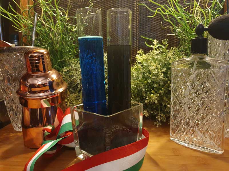 Preparazione: direttamente in 2 grosse provette da laboratorio (facilmente acquistabili all’Ikea). Una blu con vodka gelata a meno 18 gradi, spirulina 0,1 grammi, essenza di viola vaporizzata (mescolare bene); una nera con gin gelato a meno 18 gradi, nero Fabbri (quanto basta alla colorazione voluta), essenza di bergamotto vaporizzata. Servire in un contenitore con ghiaccio tritato oppure con sabbia nera per mantenere in piedi le provette.