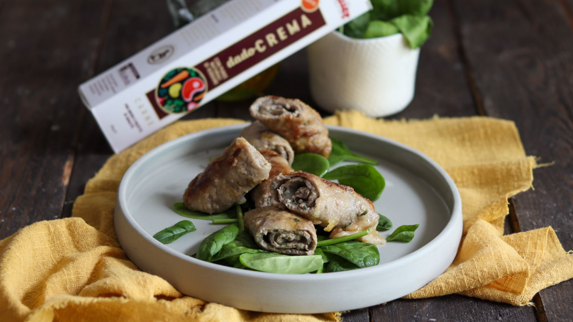 Per realizzare questi deliziosi involtini servono: ● 6 fettine di carne di scottona ● 6 fettine di formaggio tipo asiago o caciotta ● un cucchiaino di DADOCREMA CARNE Bauer ● olio extra vergine d’oliva ● un trito di rosmarino e salvia ● farina q.b. ● insalatina fresca per accompagnare