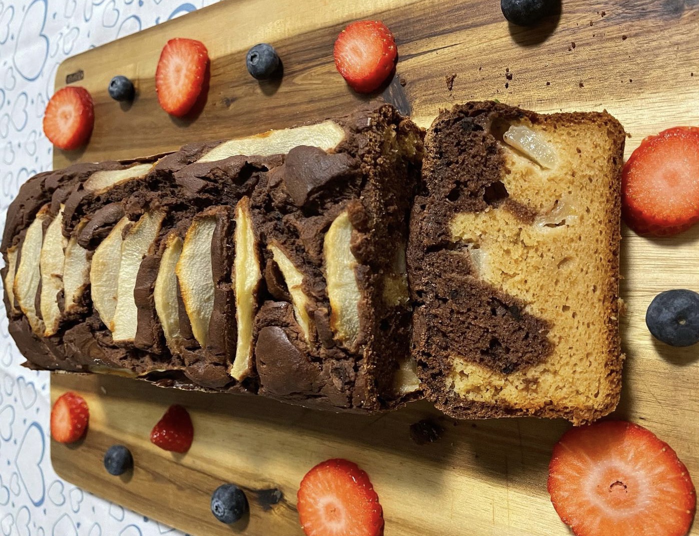 Versiamo un po’ di composto bianco e mettiamo metà della pera a fette sottili, dopodiché aggiungiamo l’altra metà impasto mescolato al cacao e affondiamo una spatola su e giù per fare l’effetto variegato, infine mettiamo in superficie la restante pera a fettine.