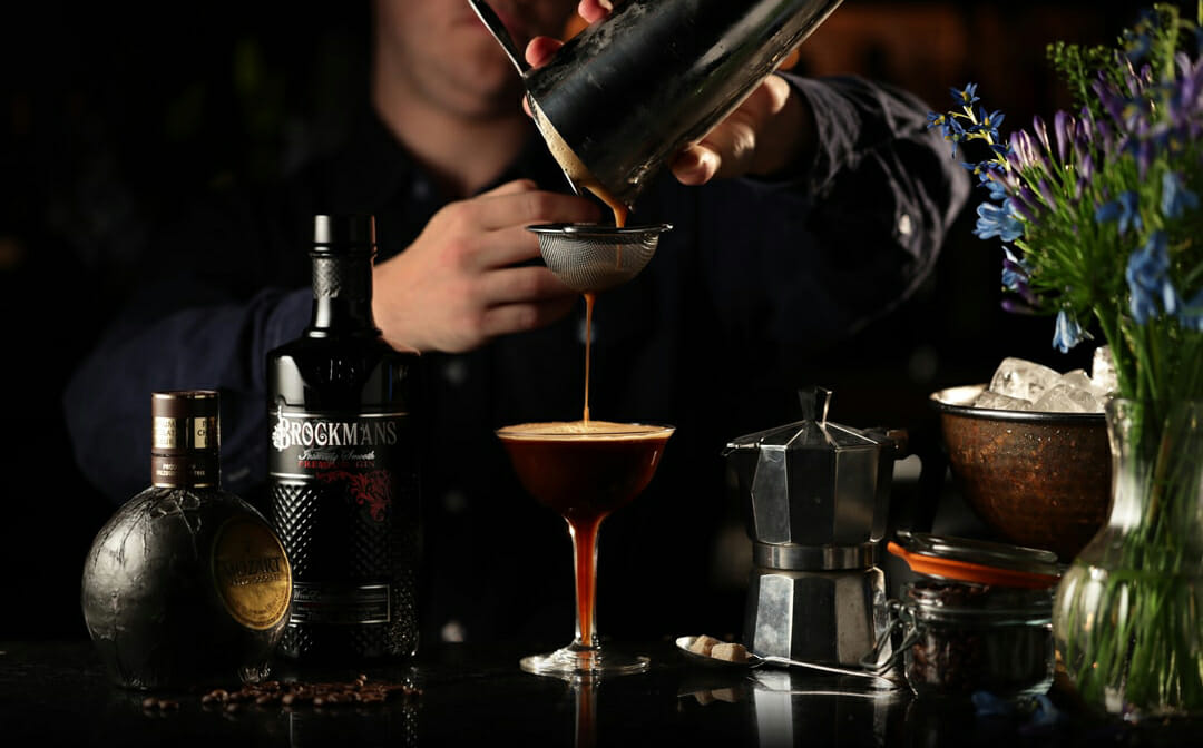 1.Aggiungere il gin Brockmans, il liquore al cioccolato fondente e un bicchierino di caffè espresso in uno shaker di ghiaccio e agitare vigorosamente.