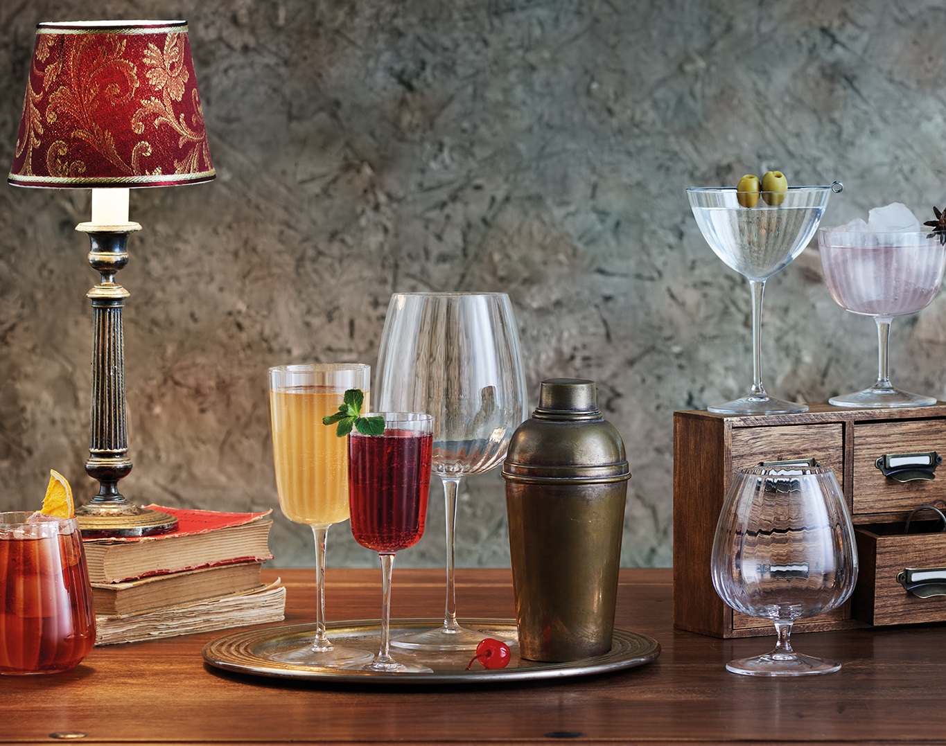 • Delicate decorazioni per i calici della collezione Bartender Novecento; i modelli Cocktail, Martini, Fizz e Nick&Nora, sono stati rivisitati con i raffinati decori in stile Liberty e Art Déco. Questi calicini sposano la tendenza dei cocktails più contenuti ma sempre attentamente ricercati.