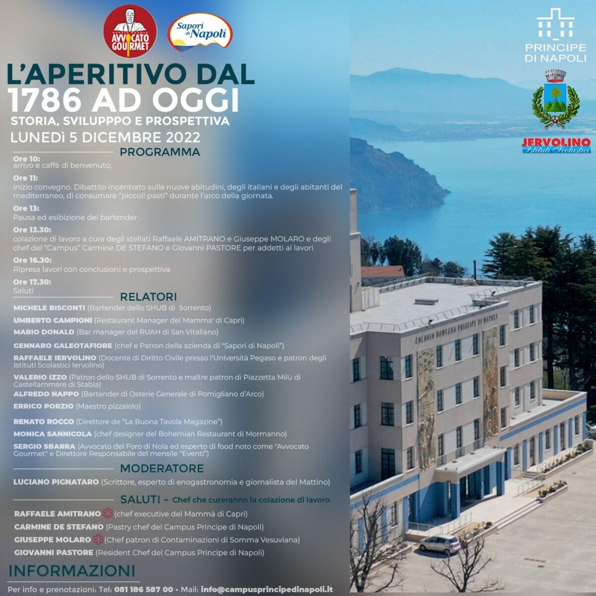 Lunedì 5 dicembre la splendida location a picco sul mare del “Campus Principe di Napoli” di Agerola, incantevole perla della Penisola Sorrentina, apre le sue porte ad un evento interamente dedicato ad uno dei più antichi e iconici rituali dell’italianità: l’Aperitivo.