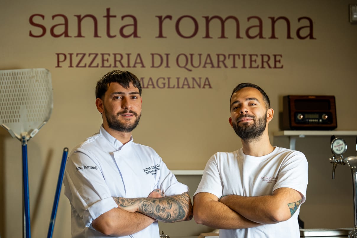 In zona Magliana Davide Rotundo e il fratello Raoul, giovane e promettente pizzaiolo, presentano il loro nuovo progetto ‘Santa Romana – Pizzeria di Quartiere’, con l’iconica pizza romana, una cucina schietta e immediata, in un ambiente caldo e accogliente
