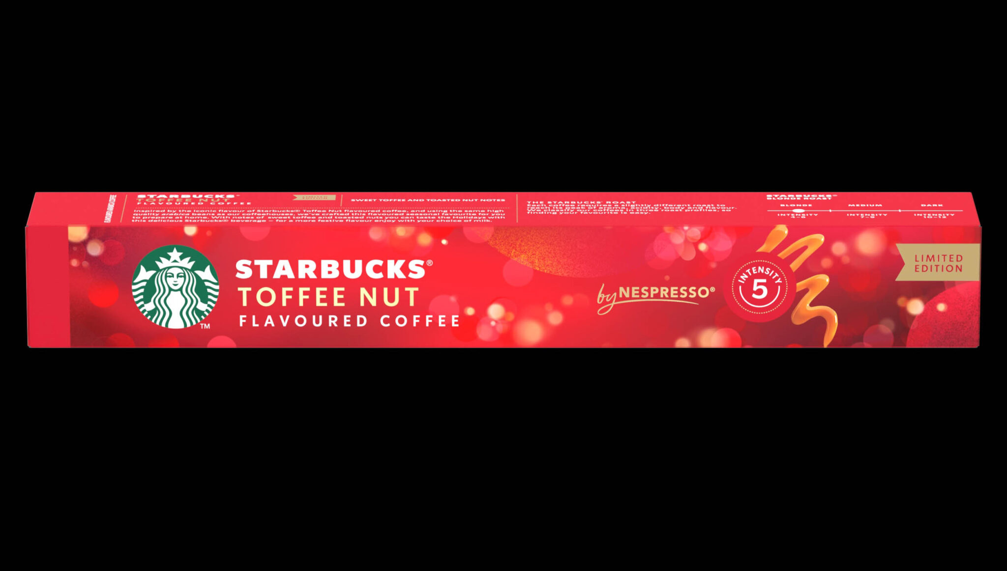 La Limited Edition Starbucks Toffee Nut by Nespresso è una bevanda aromatizzata che sorprenderà tutti: realizzata con gli stessi chicchi di caffè 100% Arabica usati nelle caffetterie Starbucks (intensità 5 su 12, tostatura chiara), sarà la miscela ideale da gustare per trascorrere momenti di gioia conviviale. L’aroma al caramello e nocciole tostate è il perfetto connubio nel clima di festa e luci colorate.