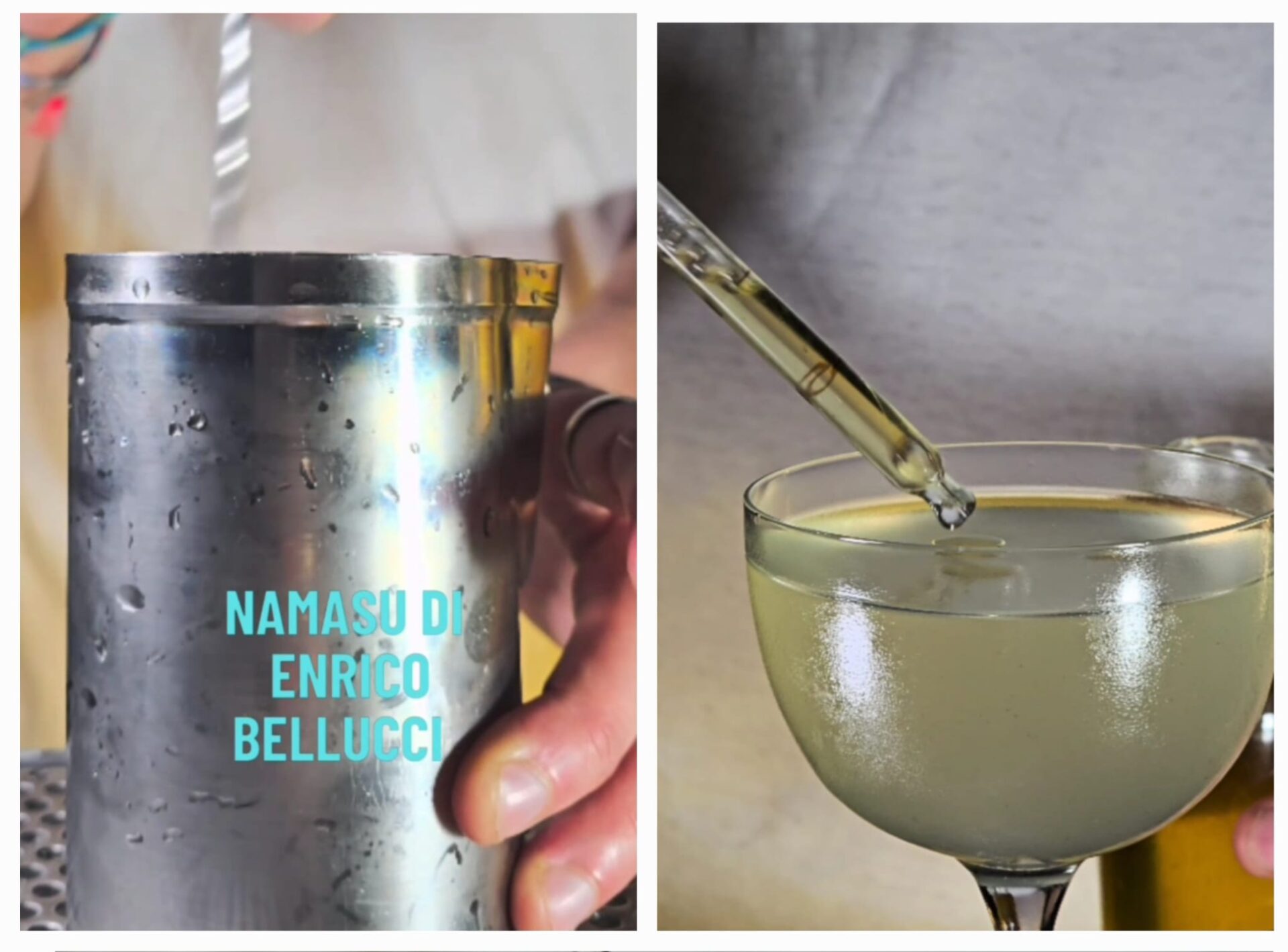 Il cocktail Namasu, ideato da Enrico Bellucci durante la Palermo Cocktail Week presso il bar Sartoria di cui era guest, rappresenta un’innovativa reinterpretazione del classicissimo Martini. La ricetta prevede l’utilizzo di tequila Altos Plata, sciroppo di cetriolo lattofermentato, “fake lime” e peperoncino Itori Togarashi, con una garnish di olio di sesamo tostato. Il tutto servito in coppetta.