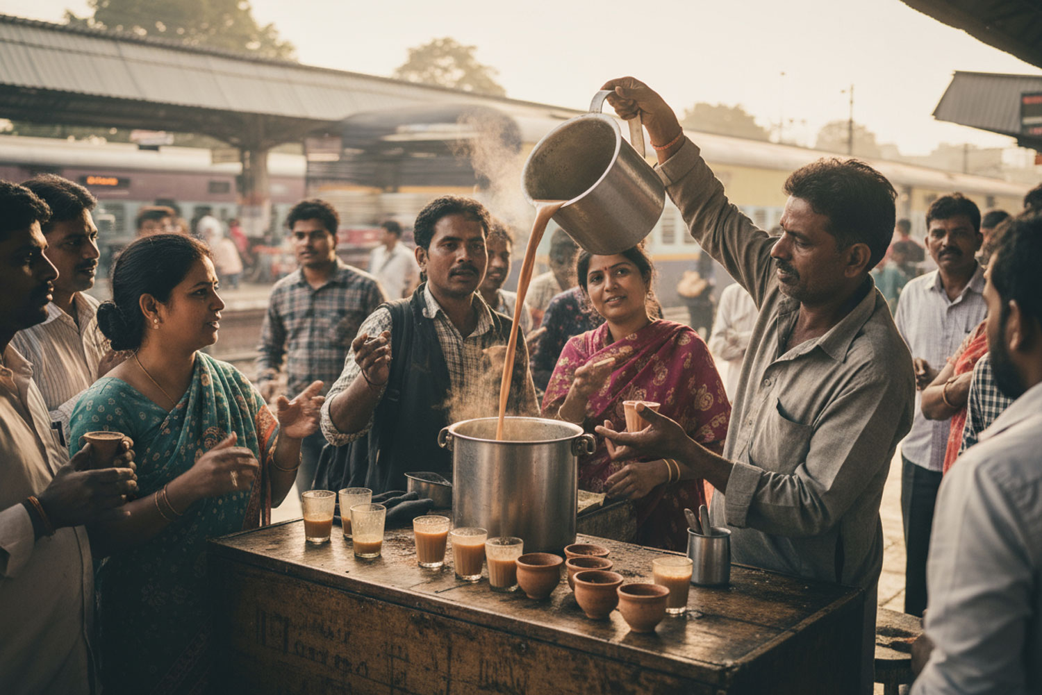 In India il masala chai non è solo una bevanda domestica: è anche un rito sociale. Nelle stazioni, nei mercati e lungo le strade, i chai wallah – i venditori ambulanti – servono il tè in piccoli bicchieri di vetro o in tazze di terracotta.